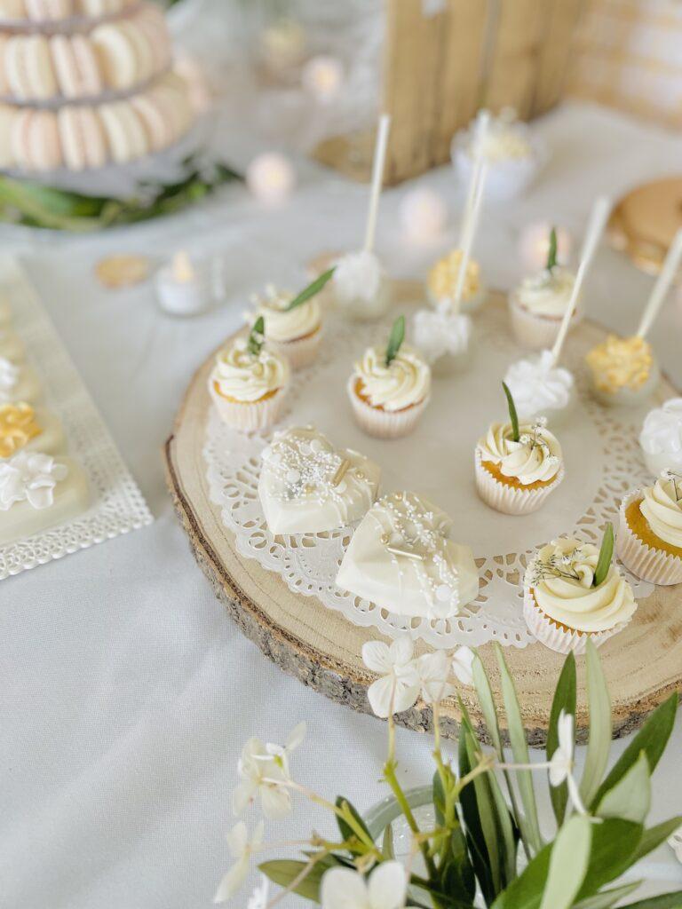 Une variété de mini desserts décorés pour accompagner votre Table Gourmande : macarons, cupcakes, mini magnums, cake pops, madeleines, mini cupcakes
